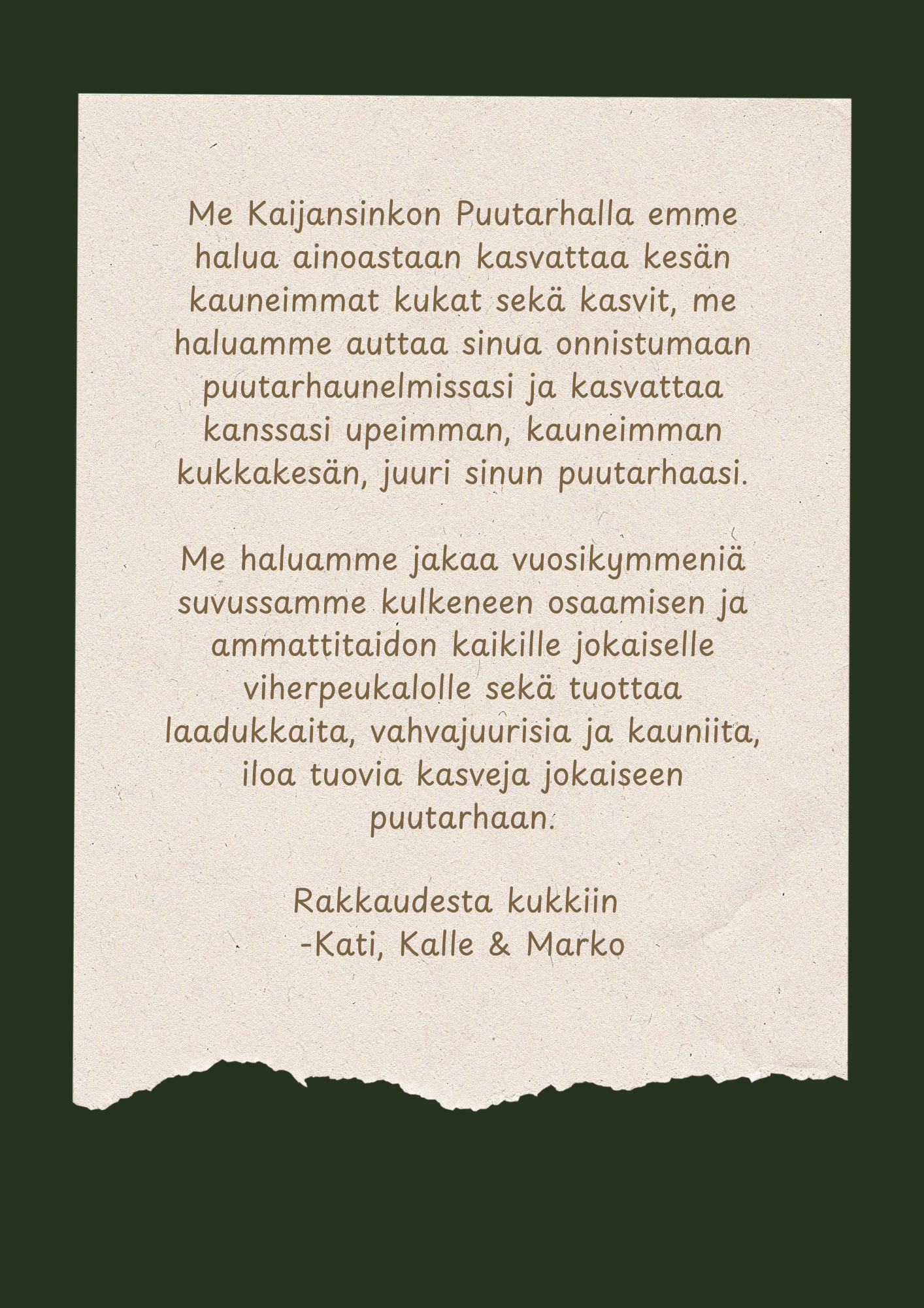 Meille on tärkeää, että tuotteissamme näkyy sukupolvien ajan kulkenut rakkaus viljelyyn sekä ammattitaito laadukkaiden kasvien tuottamiseen. Haluamme mahdollistaa kaikille asiakkaillemme upeimpien puutarhaunelmienne toteutumisen jakamalla taitomme ja tietomme myös asiakkaillemme erinomaisen ja erottuvan palvelun kautta.